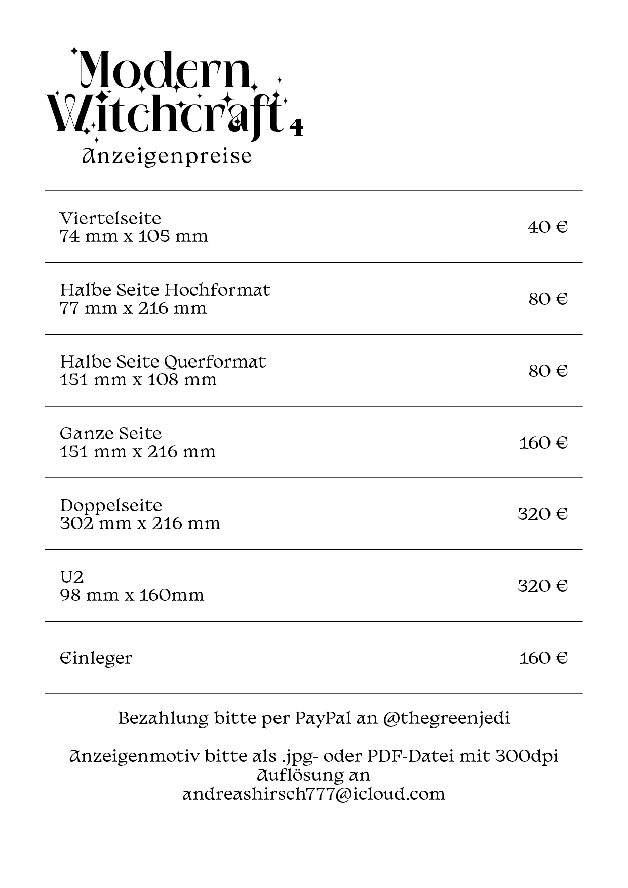 Das Zine “Modern Witchcraft” gibt verschiedenen Stimmen Raum, ihre Gedanken über Magie, Naturmystik, Queerness, Achtsamkeit, Gemeinschaft und Nachhaltigkeit zum Ausdruck zu bringen. Jede*r Magie-Praktizierende*r ist eingeladen sich zu beteiligen. Du kannst gerne einen Beitrag einreichen und/oder eine Anzeige buchen.